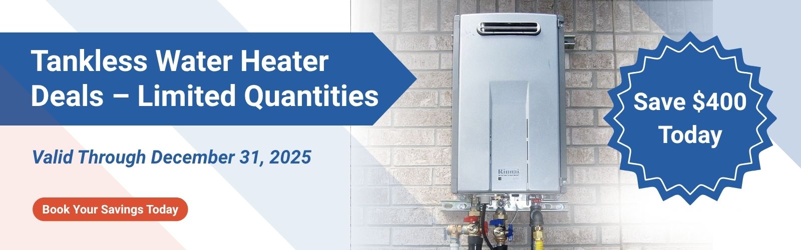 Upgrade to endless hot water on demand and save $400 OFF select tankless water heaters. Choose from leading brands such as Navien, Rinnai, Noritz, Bosch, and Rheem.